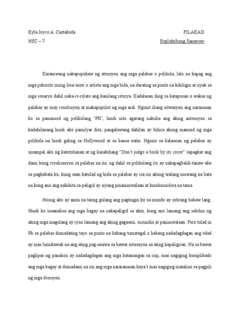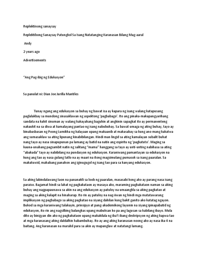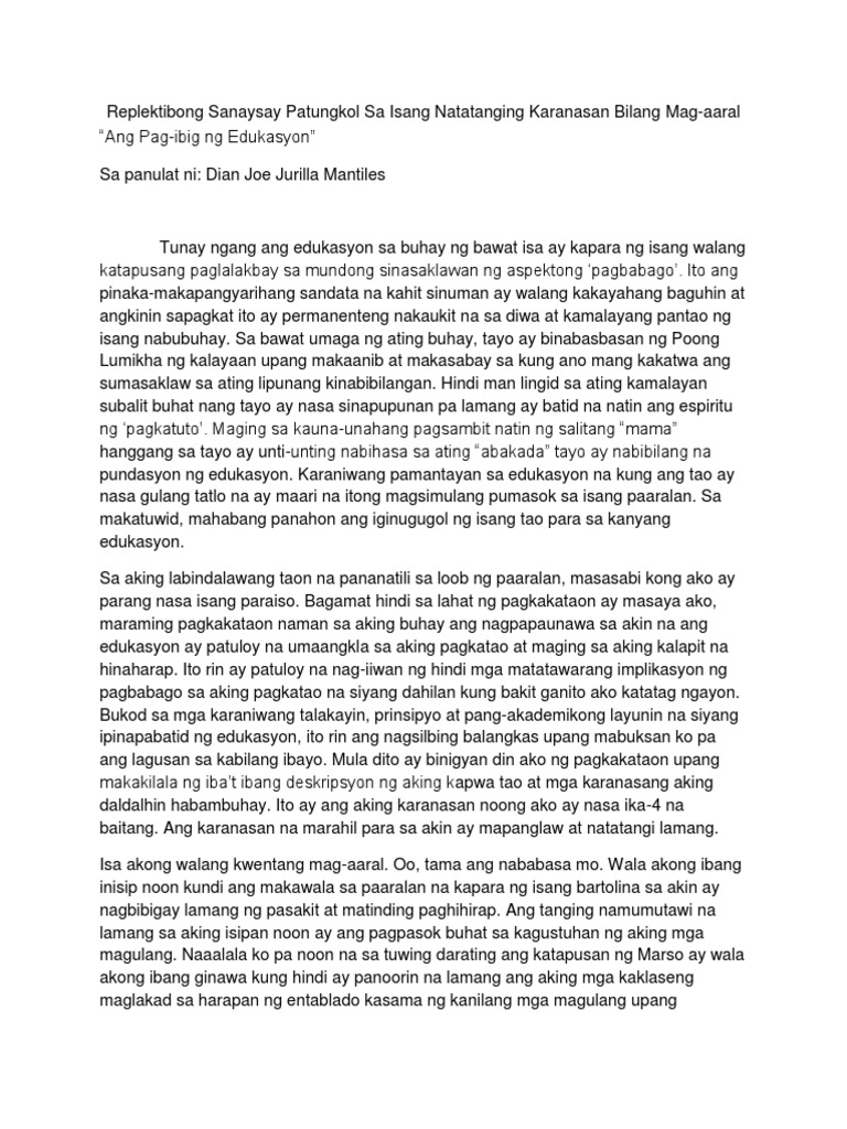Replektibong sanaysay halimbawa. August 2 2018 October 14. Halimbawa ng mga paksang maaaring gawan ng replektibong sanaysay 1 librong katatapos lamang basahin. Flag for inappropriate content.