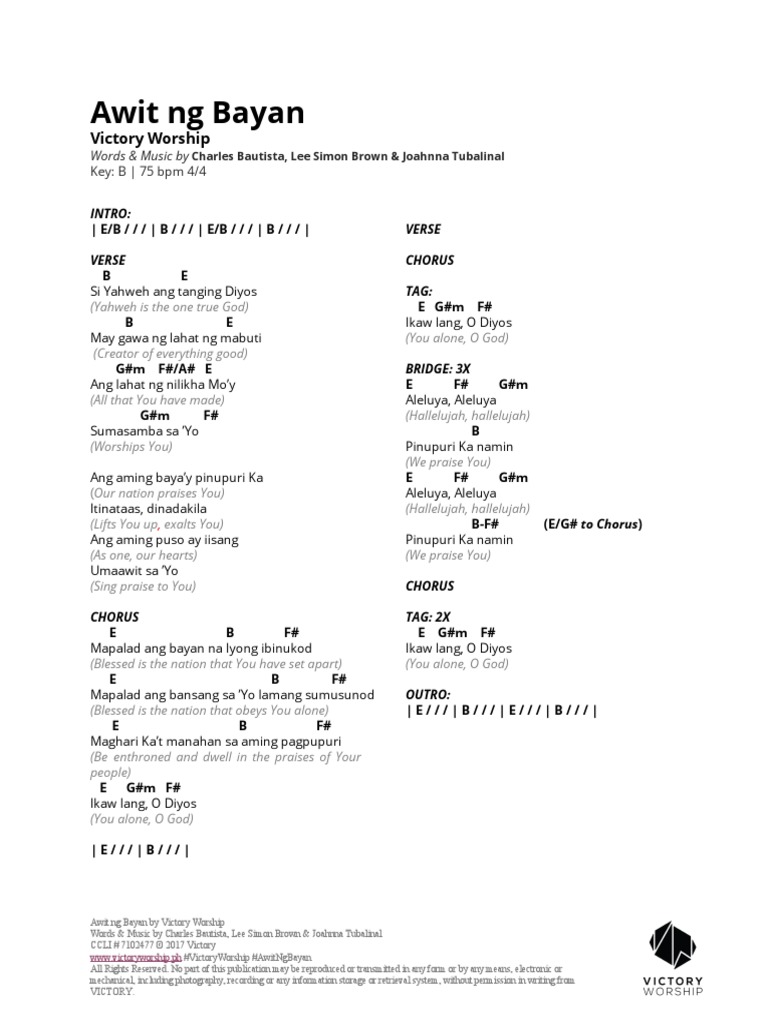 Create and get 5 IQ. This is AWIT NG BAYAN by Victory Worship LYRICS with CHORDS GUITAR BASS and PIANO Tutorial. Awit Ng Bayan chords by Victory Worship Intro E A E A Verse E A Si Yahweh ang tanging Diyos E A May gawa ng lahat ng mabuti Cm BD A Ang lahat ng nilikha Moy Cm B Sumasamba sa Yo E A Ang.