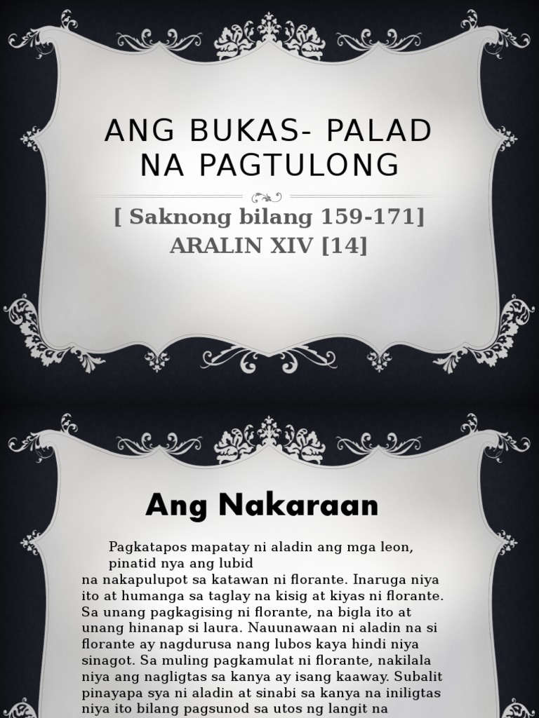NA PAGTULONG Saknong bilang 159-171 ARALIN XIV 14 Ang Nakaraan Pagkatapos mapatay ni aladin ang mga leon pinatid nya ang lubid na nakapulupot sa katawan ni florante. Pero kahit wala masyadong ari-arian ang tao ay maaari pa rin itong magbigay.